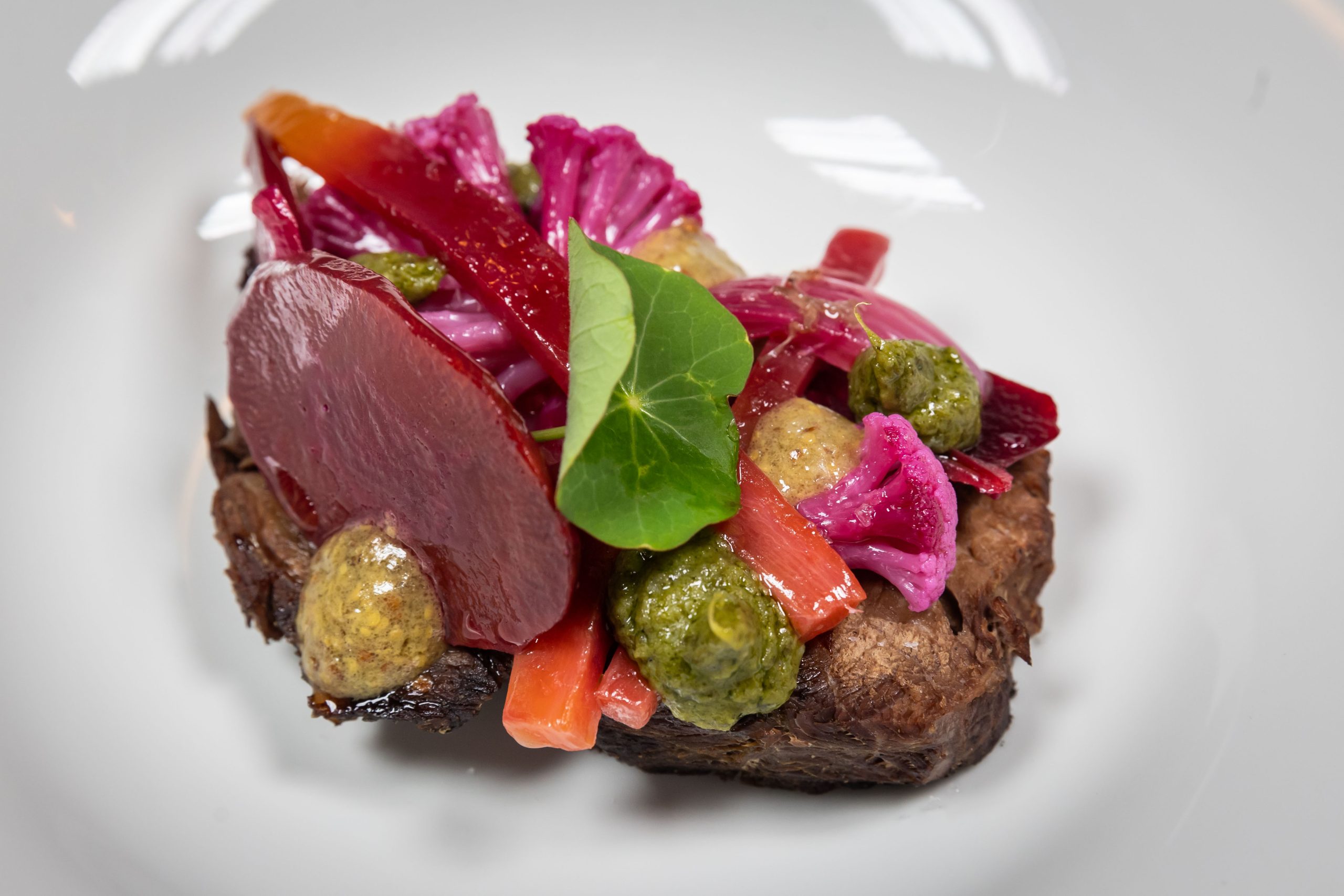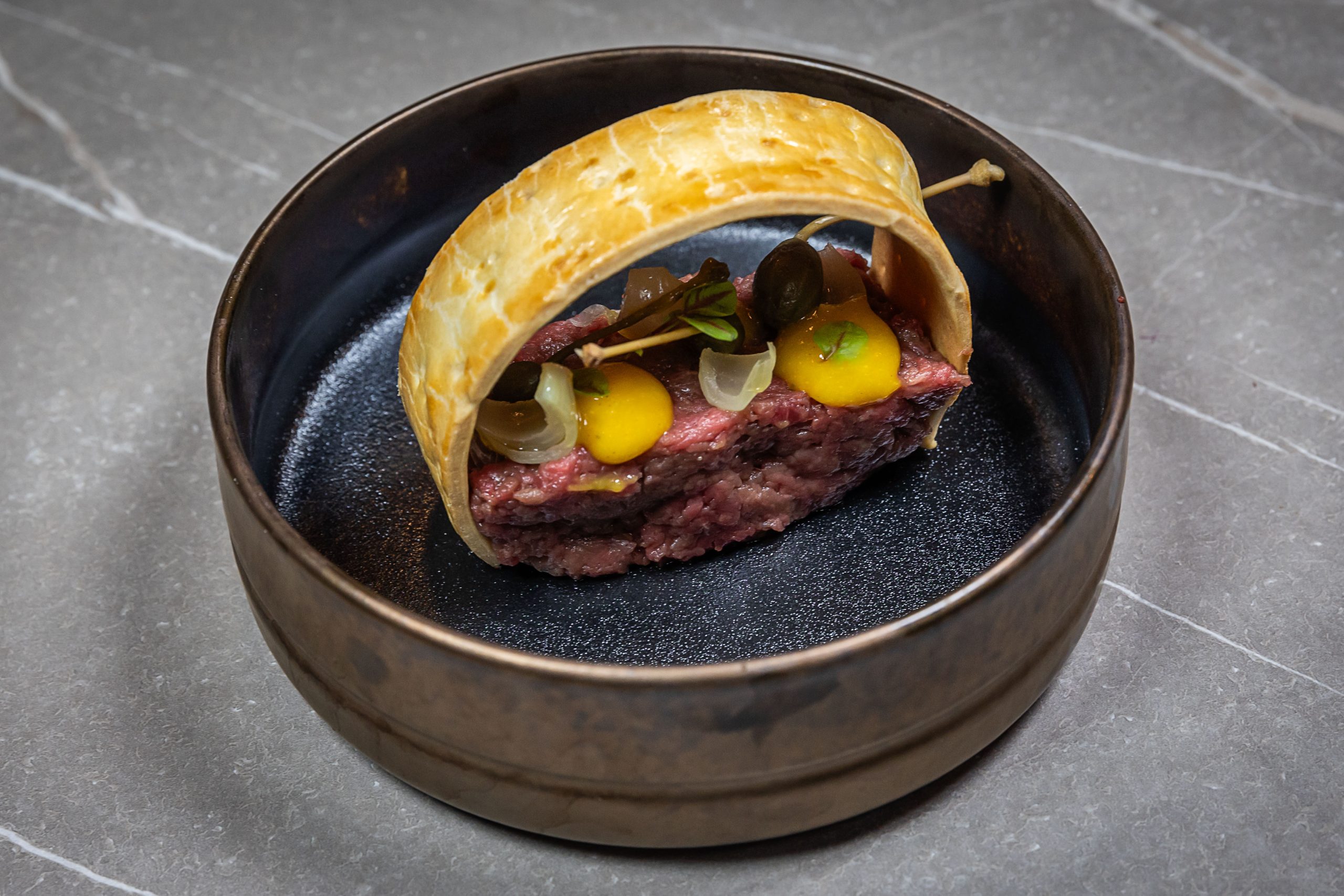 Tra cui il Bollito non bollito (cappello del prete, giardiniera, senape e salsa verde) e la Battuta di manzo con pasta brisée e cipolline in agrodolce.